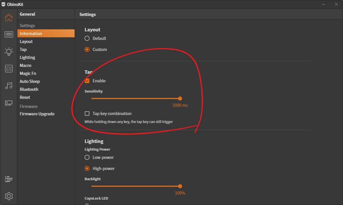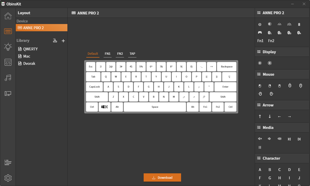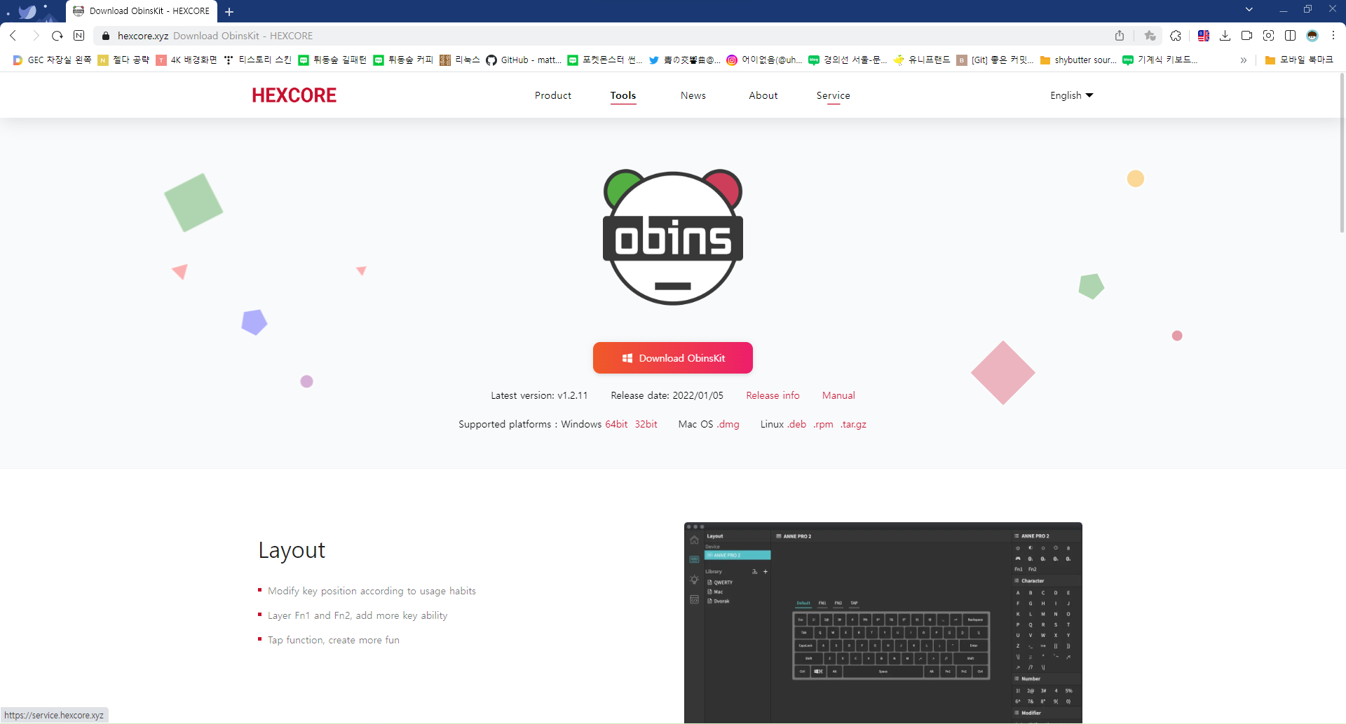위 사이트로 들어가면 앤프로2 전용 소프트웨어 'obinskit'이 존재합니다. 제품 설명서에도 직접 접속할 수 있도록 QR코드가 담겨있었습니다. 윈도우뿐 아니라 macOS, 데비안 기반 리눅스, 레드햇 기반 리눅스까지 모두 동일한 UI로 사용이 가능한 것 같습니다. 아마 Electron 프레임워크로 제작되었을거라 추측이 됩니다. 이 프로그램을 백그라운드에 계속 켜놓고 있으면 캡스락 토글 여부도 팝업으로 확인할 수 있습니다. 또한, 프로그램에서 키보드의 배터리 잔량, 가동 시간도 확인할 수 있습니다.