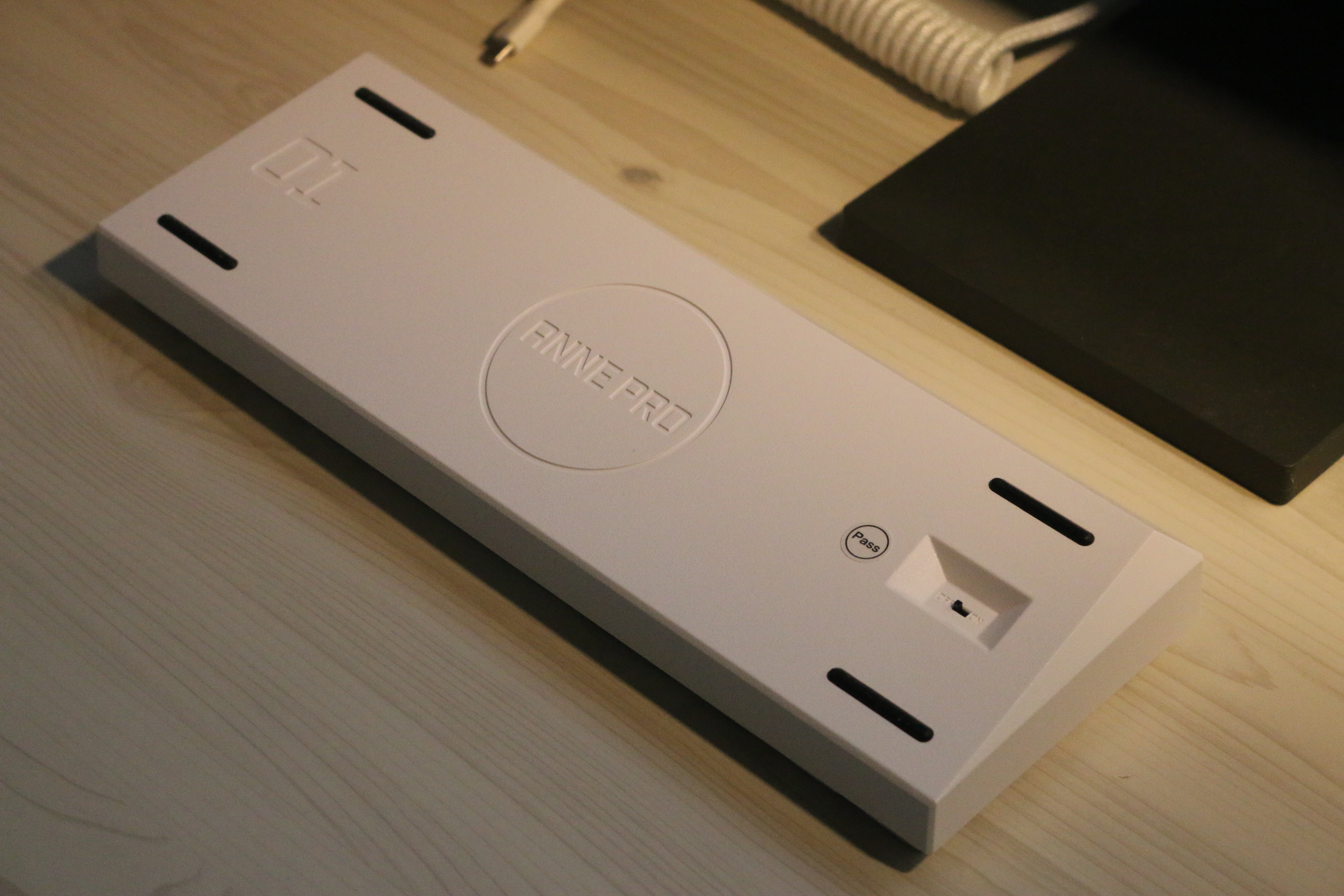 뒷면도 상당히 깔끔하게 생겼습니다. 앤 프로 로고와 전원 스위치, QC 스티커로 추정되는 것, 미끄럼 방지 고무들이 붙어있습니다. 고무가 없더라도 기본적으로 무게가 좀 있어서 잘 미끄러지지 않을 것 같습니다.
