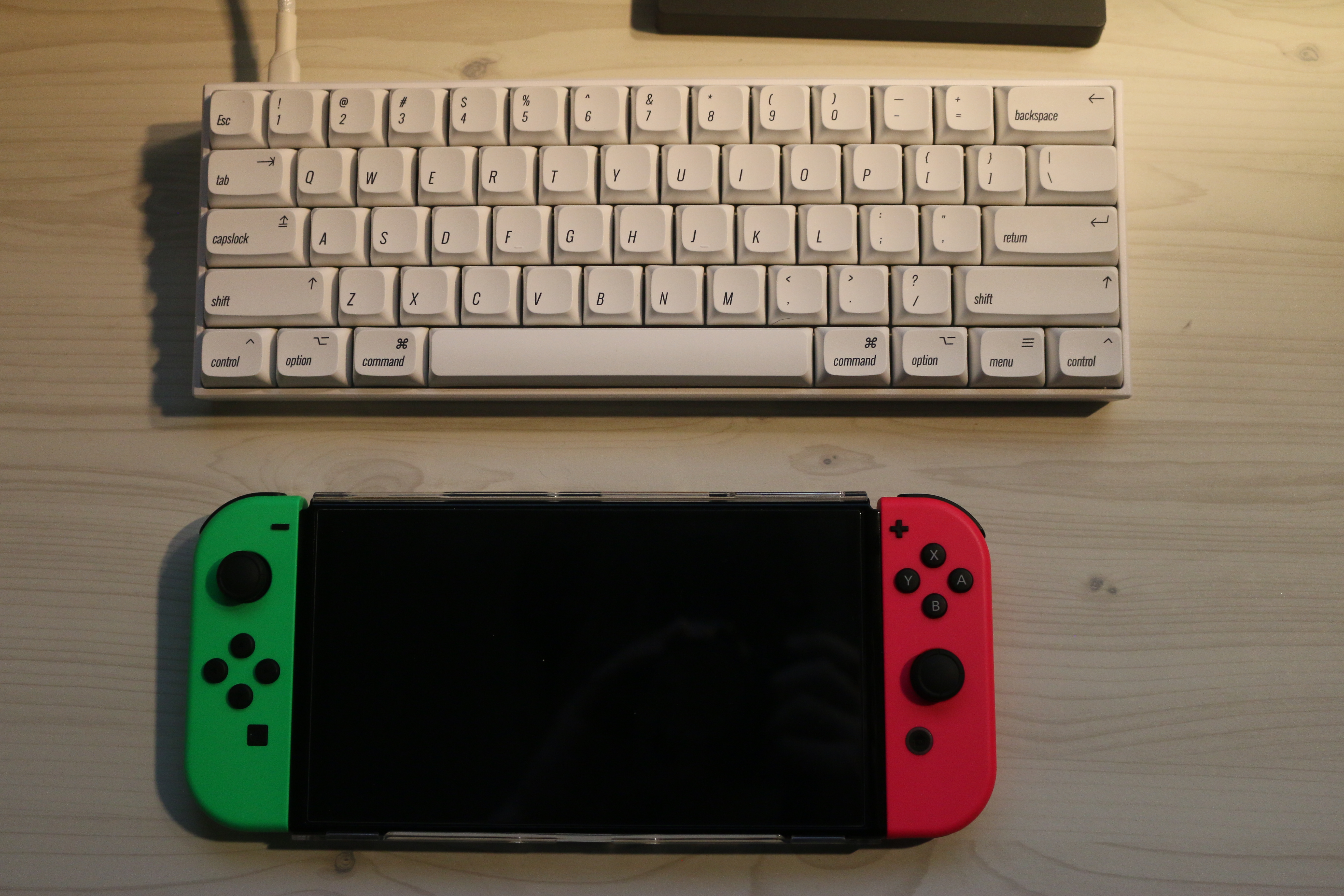 크기는 굉장히 작습니다. 세로 길이는 닌텐도 스위치와 동일하고, 가로 길이는 닌텐도 스위치보다 손가락 두 마디 큰 정도. 높이는 기존에 얇은 키보드를 쓰셨던 분이라면 적응하기 힘들 정도로, 팜 레스트를 사용하시는 편이 좋을 것 같습니다.