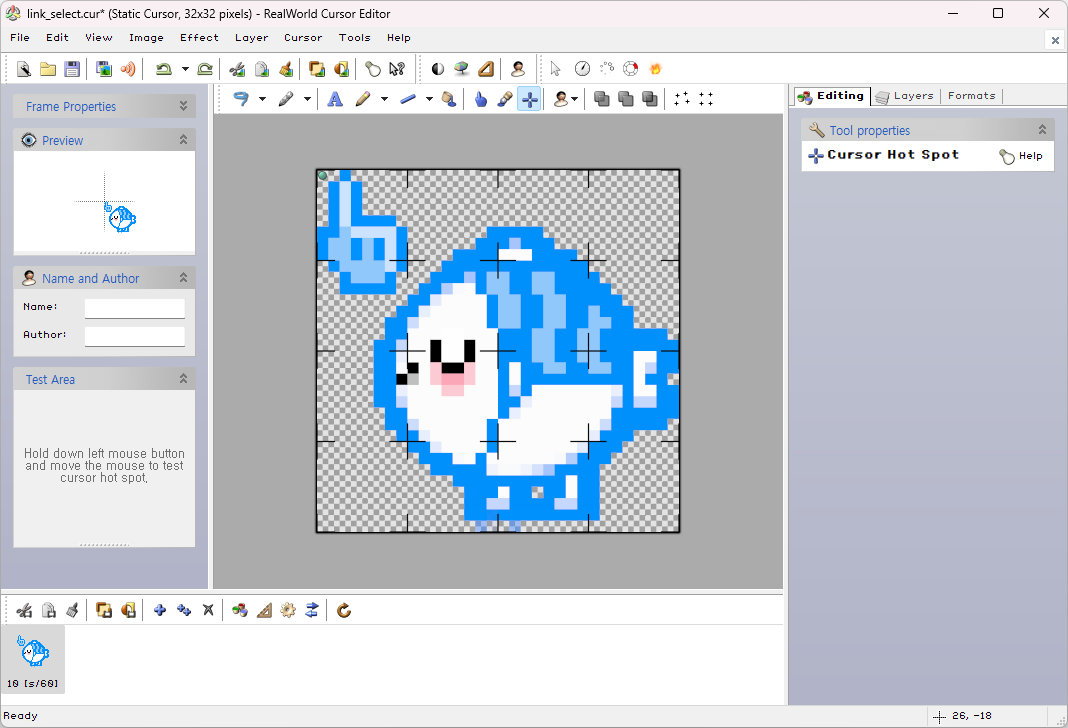 외형은 대충 이런 느낌인데 대부분은 꼬등어가 그려져있고 상태에 따라 표정에 변화도 줘봤습니다 :) 정확도를 요구하는 조절 커서나 필기 커서에는 꼬등어가 들어가기 애매해서 꼬등어 발이랑 꼬리만 추가해놨습니다.